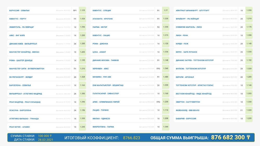 At the same time, it should be noted that events with not the highest odds were selected for the accumulator - the largest of them was equal to 1.48. Most of the bets were placed on the favourites of football matches in European competitions and the leading European championships. This consistent tactic resulted in a generous reward for the forecaster.